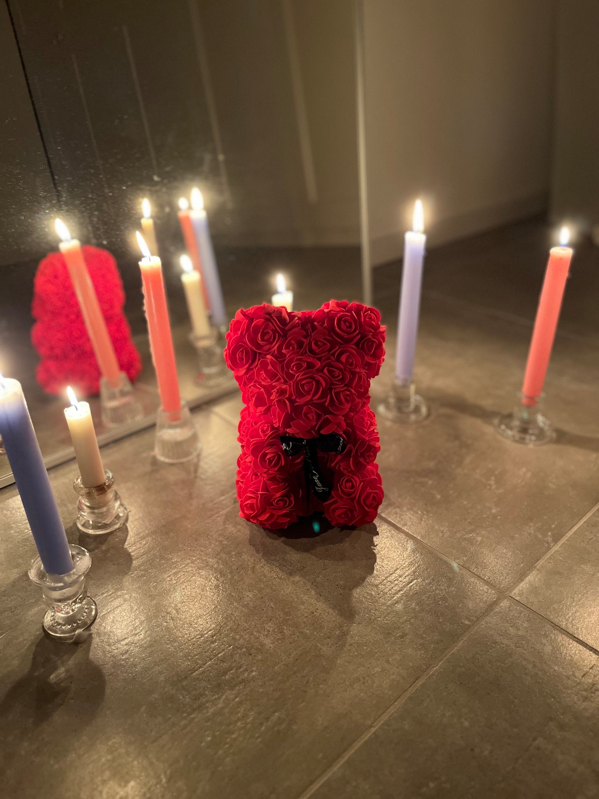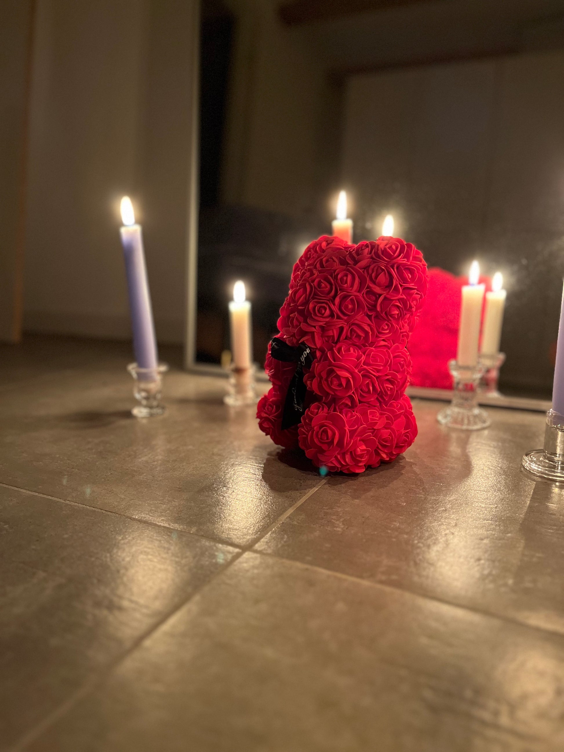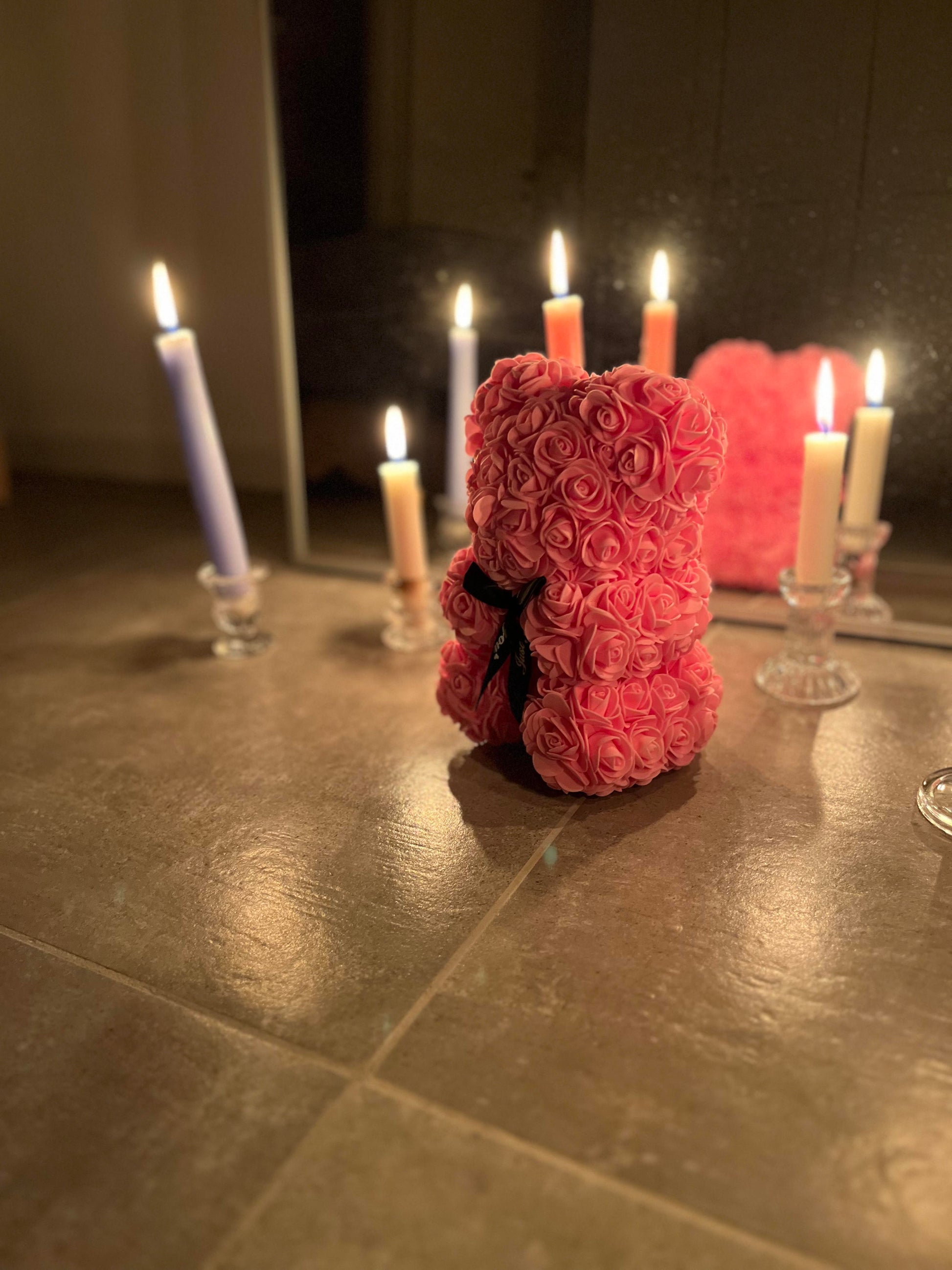 Overrask med en unik bamse lavet af smukke håndlavede roser med en god højde på 25cm.