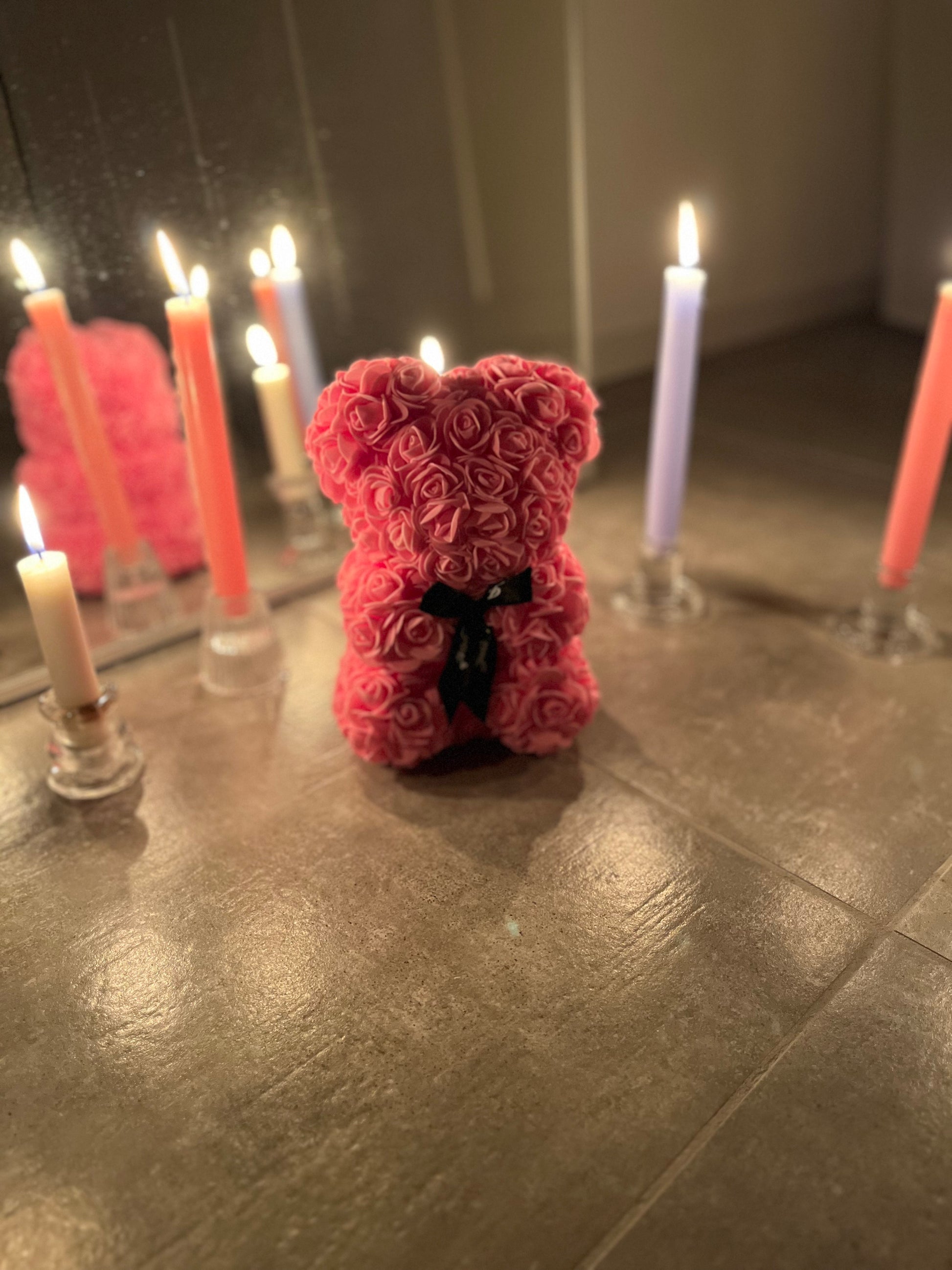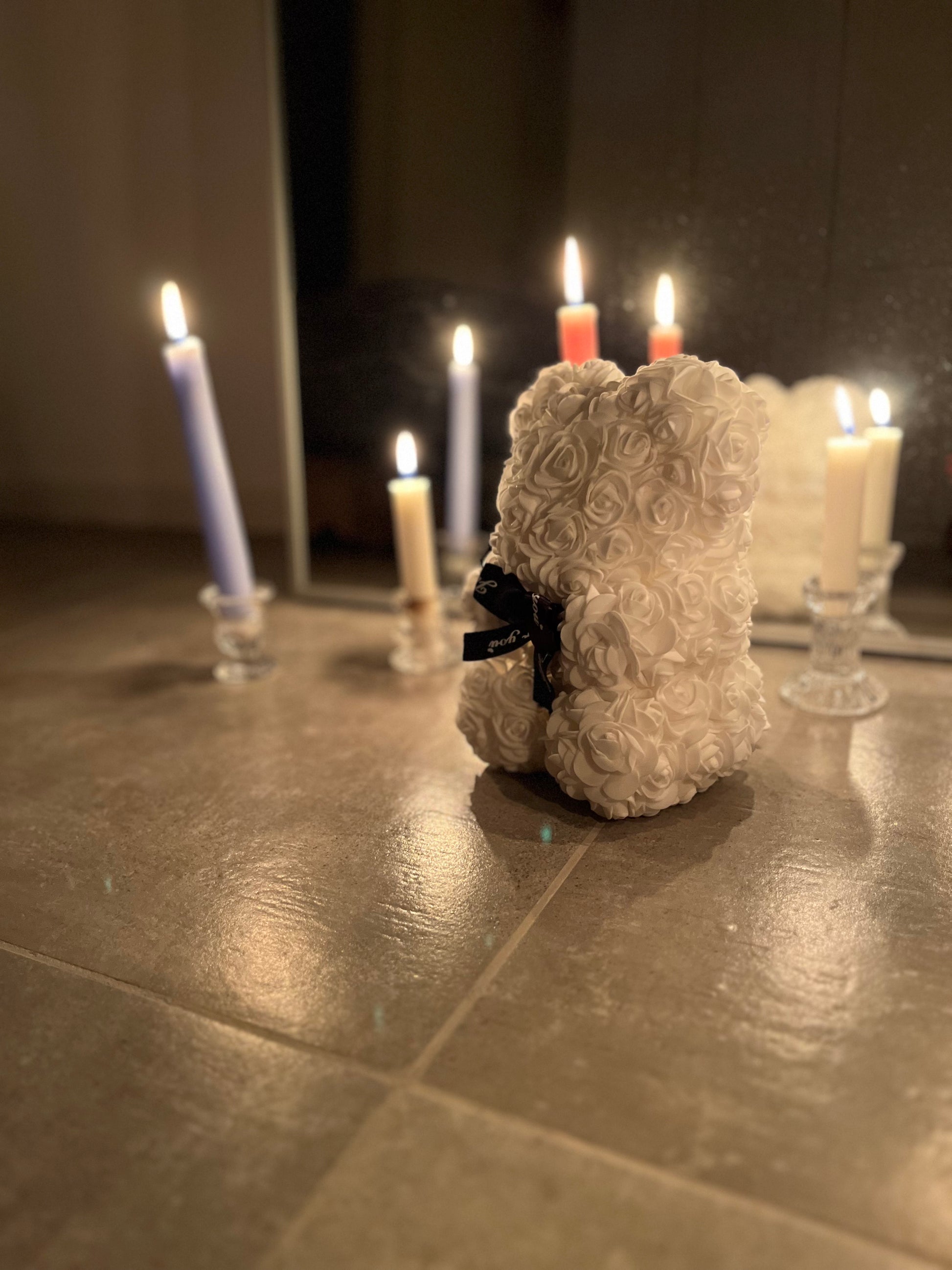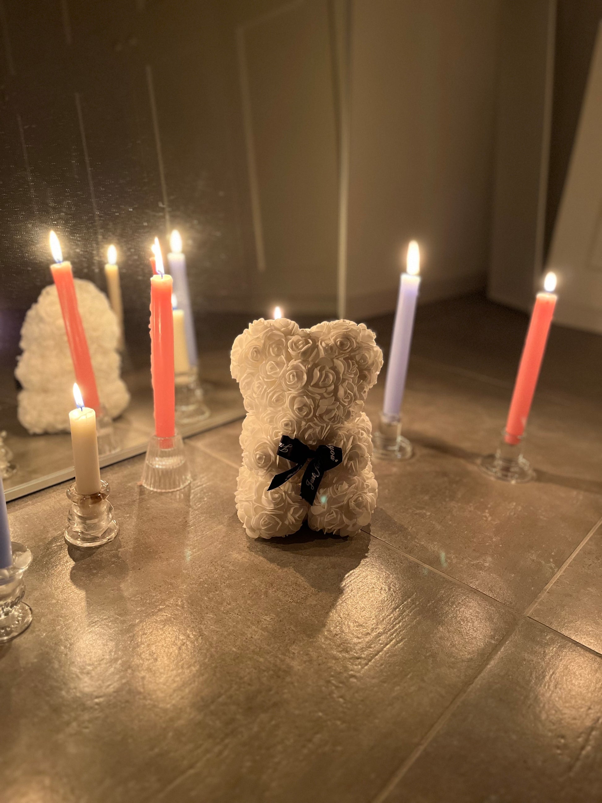 Overrask med en unik bamse lavet af smukke håndlavede roser med en god højde på 25cm.